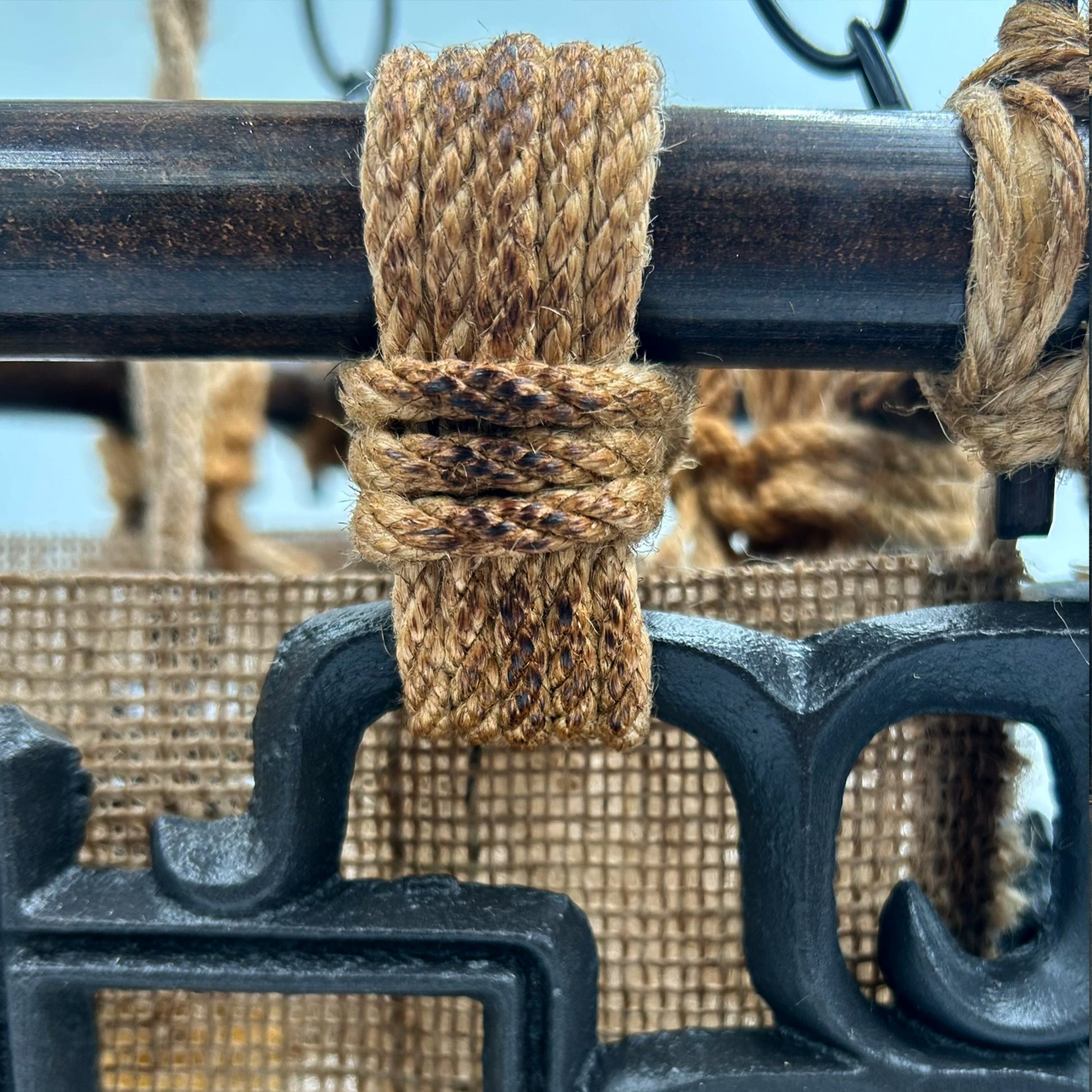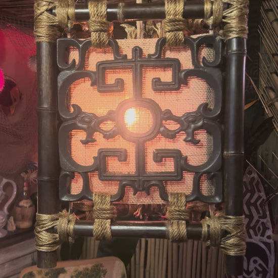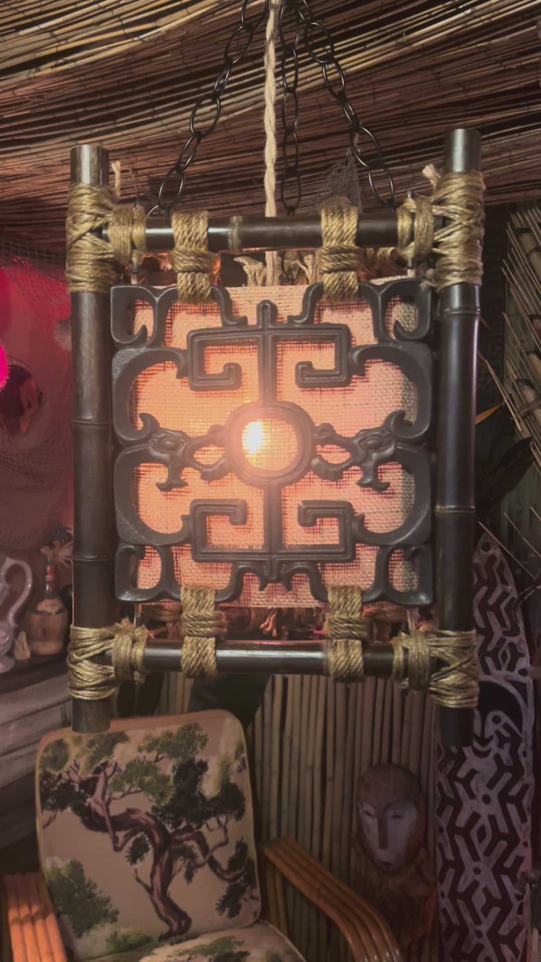 The Iron Dragon Tile is a reproduction of similar tiles found in tiki bars most popular in the 1950's and 1960's. The tiles are solid cast iron and lashed together into a bamboo frame with burnt rope details. Ready to hang in your space with a provided lamp chain. These lamps are handmade in my NY based workshop. There are no fasteners and no glue used in these lamps. Each joint is meticulously hand pegged and then tied together with traditional bamboo knot joinery.