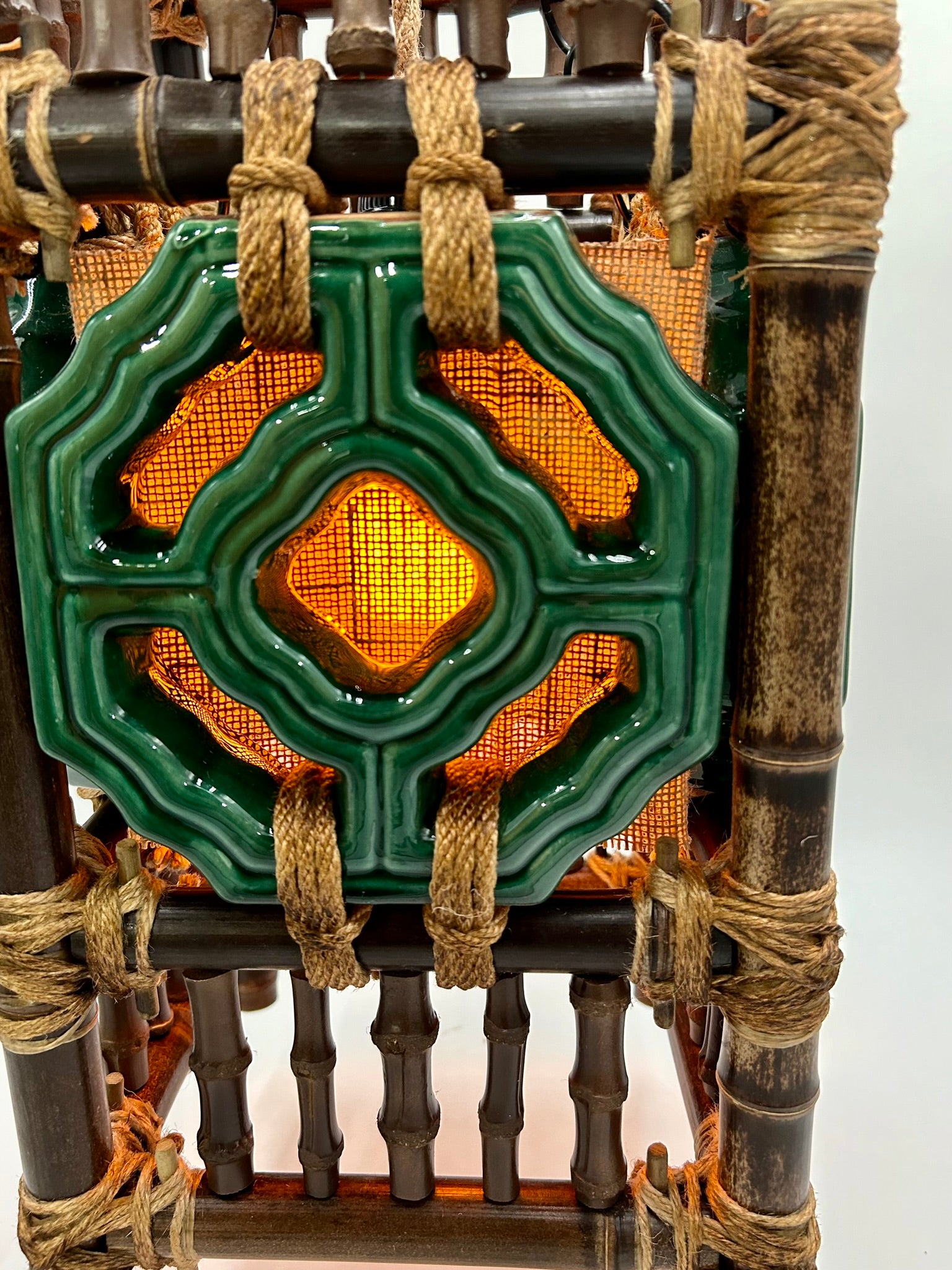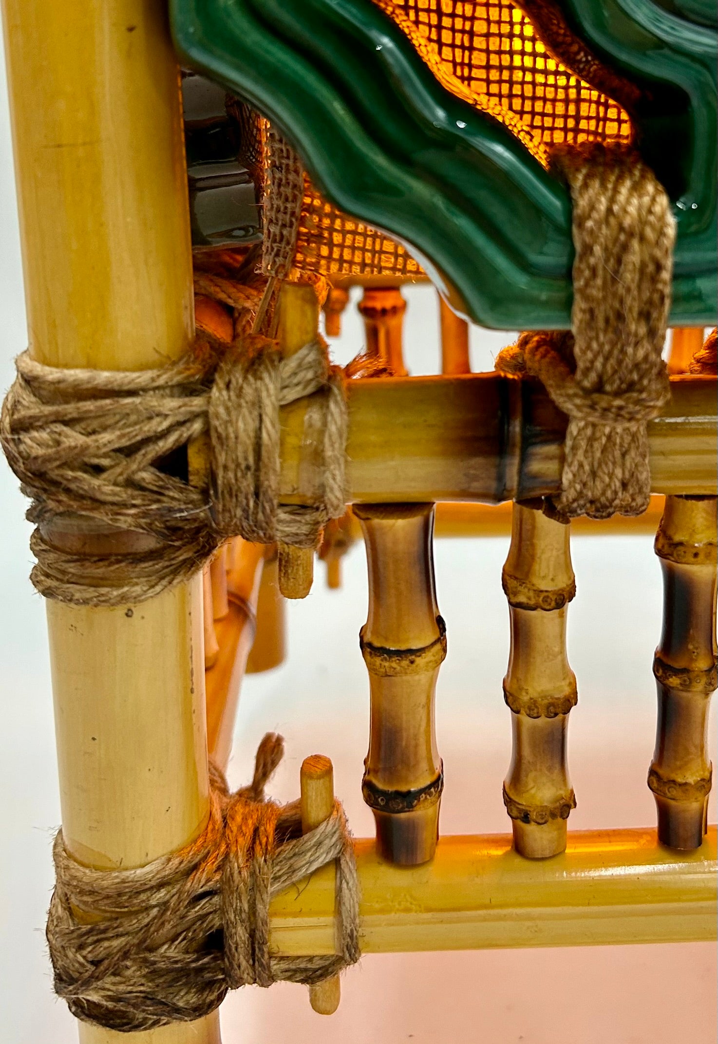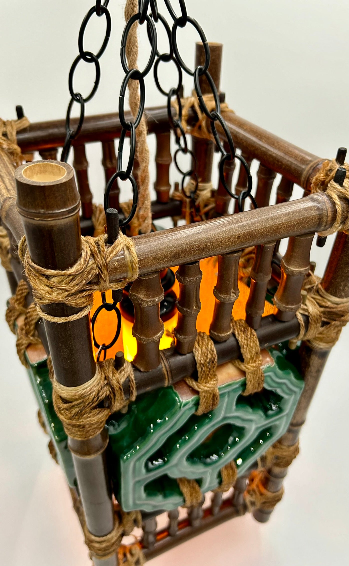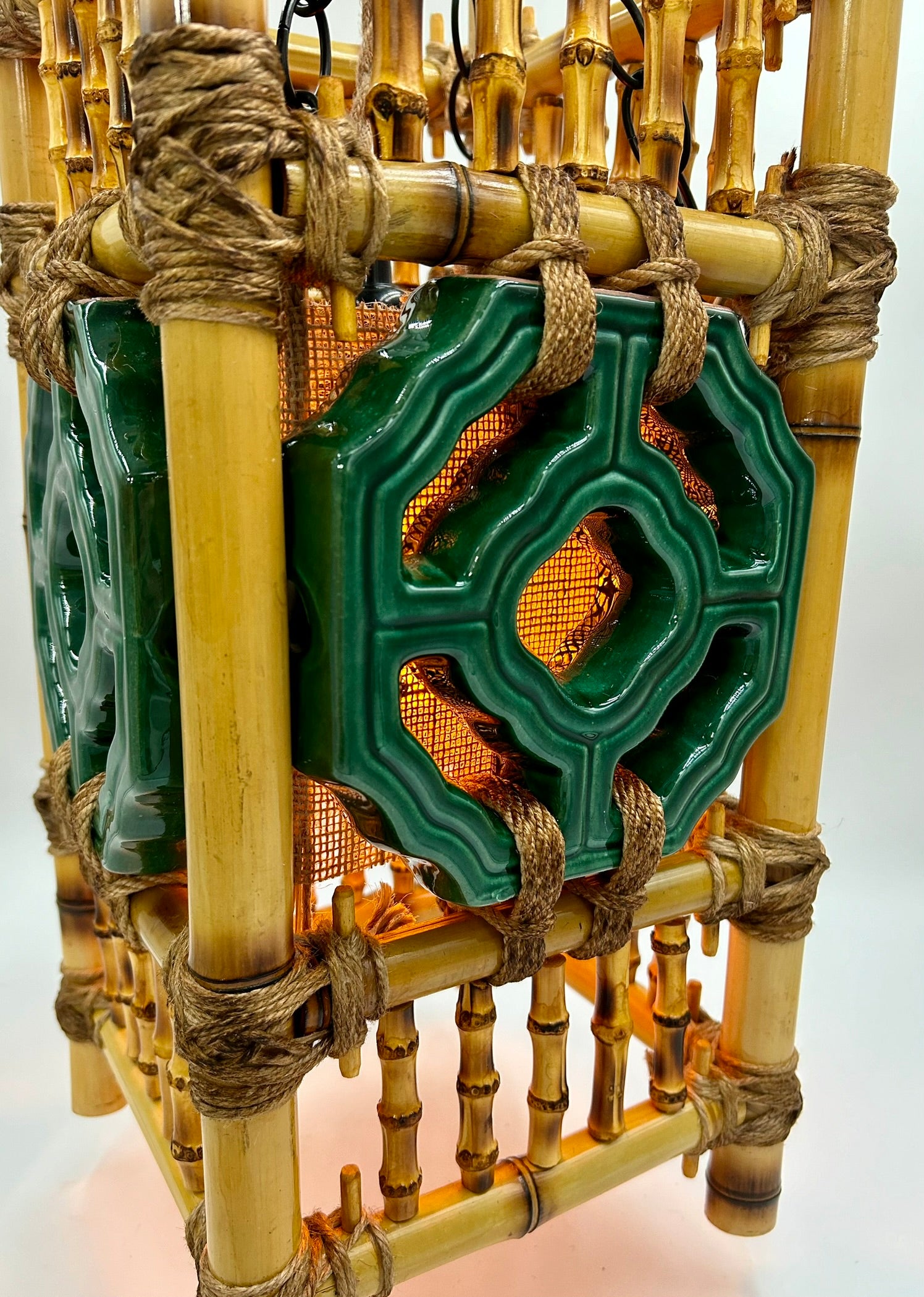 The ceramic tiles featured in this custom pendant lamp are reproductions of original designs found in Chinese architecture and Tiki rooms around the world. Tiles are fired ceramic and lashed together into a bamboo frame with burnt rope details. Ready to hang in your space with a provided lamp chain. These lamps are handmade in my NY based workshop. There are no fasteners and no glue used in these lamps. Each joint is meticulously hand pegged and then tied together with traditional bamboo knot joinery.