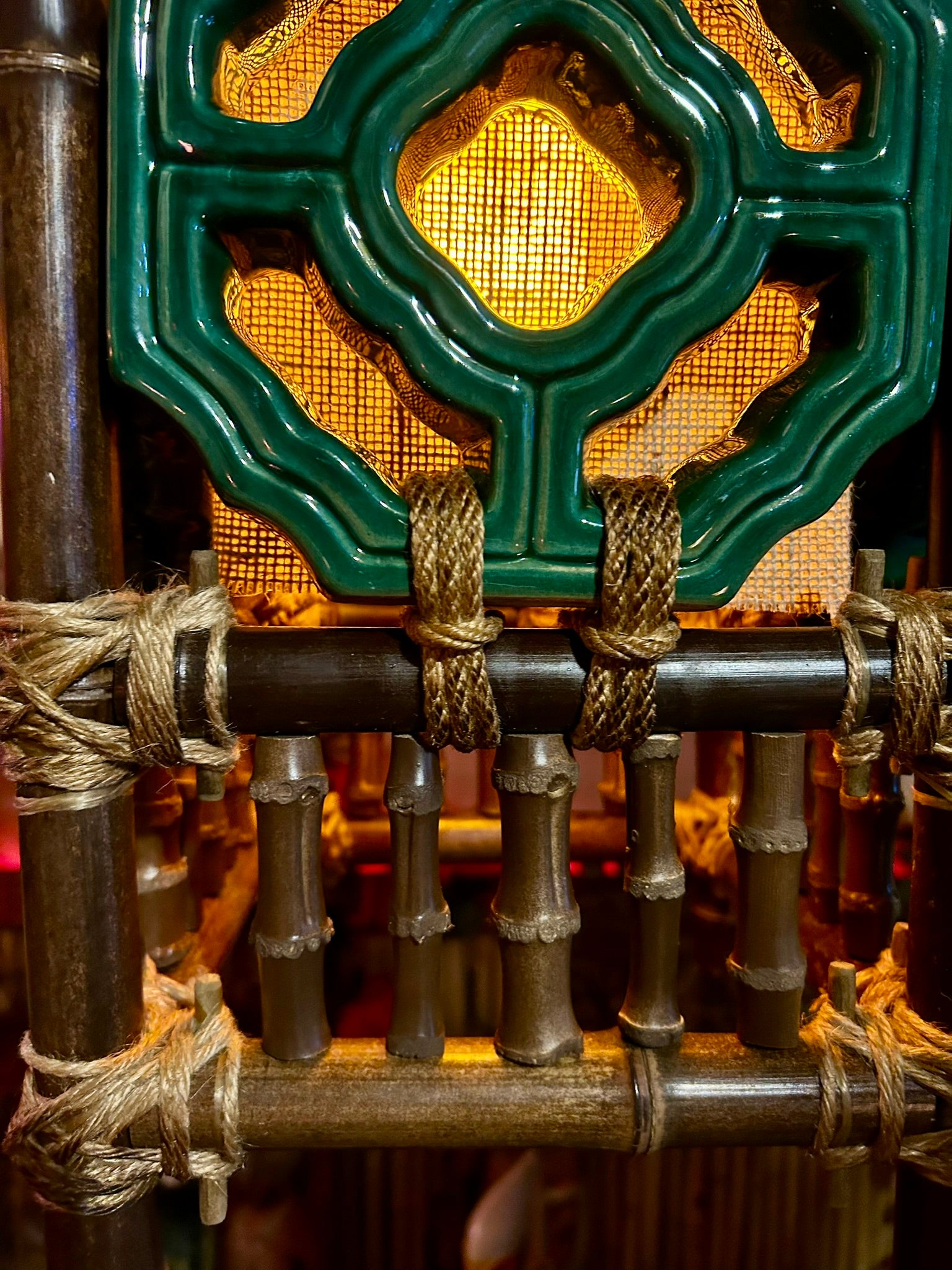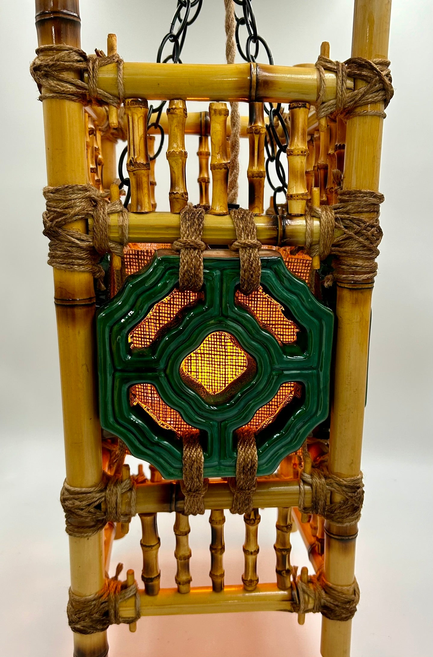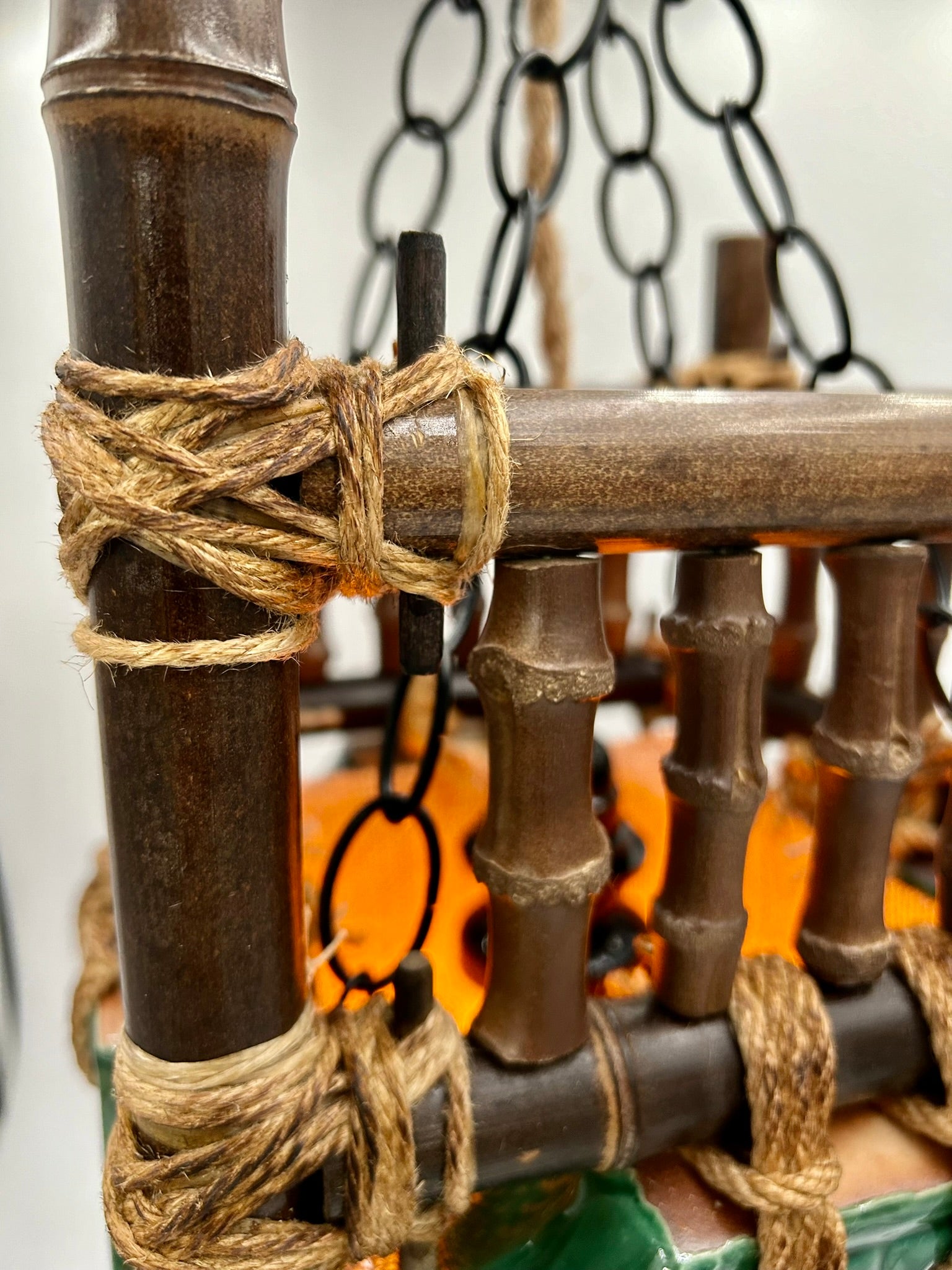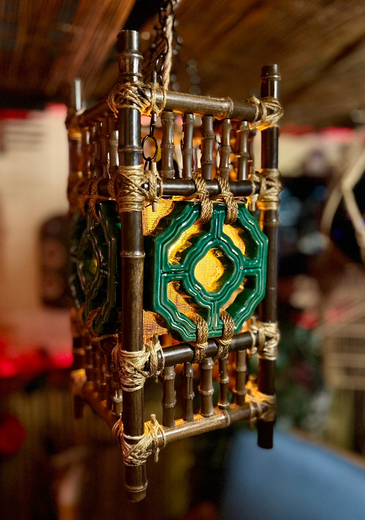 The ceramic tiles featured in this custom pendant lamp are reproductions of original designs found in Chinese architecture and Tiki rooms around the world. Tiles are fired ceramic and lashed together into a bamboo frame with burnt rope details. Ready to hang in your space with a provided lamp chain. These lamps are handmade in my NY based workshop. There are no fasteners and no glue used in these lamps. Each joint is meticulously hand pegged and then tied together with traditional bamboo knot joinery.