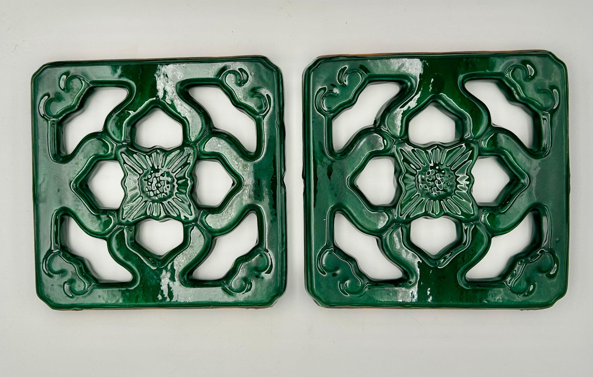 Jade Breezeway Tile, sold as a set of 2. These ceramic tiles are reproductions of original designs found in Chinese architecture and Tiki rooms around the world.